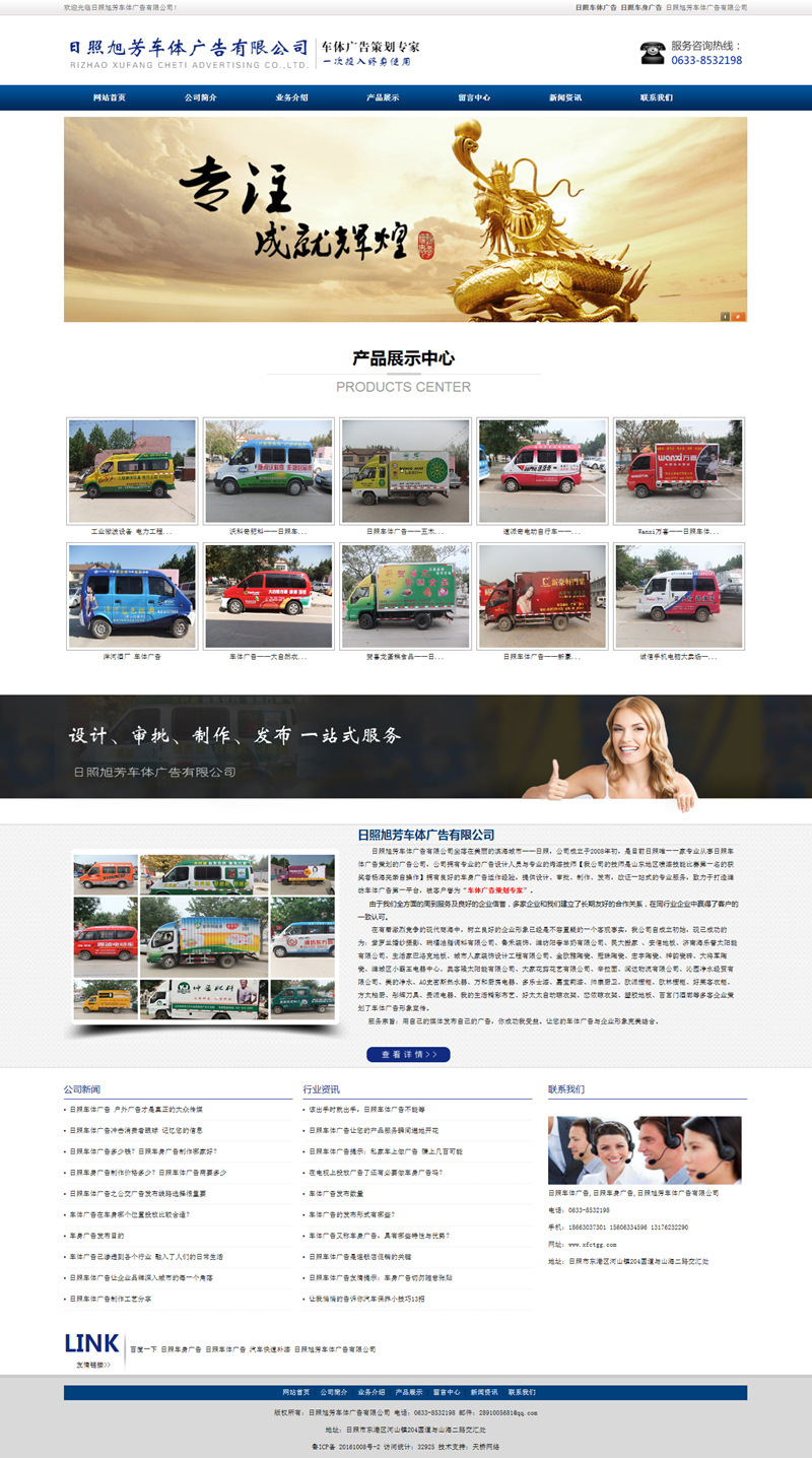 日照旭芳車體廣告有限公司坐落在美麗的濱海城市——日照,公司成立于2008年初,是目前日照唯一一家專業(yè)從事日照車體廣告策劃的廣告公司,公司擁有專業(yè)的廣告設(shè)計人員與專業(yè)的烤漆技師【我公司的技師是山東地區(qū)噴漆技能比賽第一名的獲獎者楊海亮親自操作】擁有良好的車身廣告運作經(jīng)驗,提供設(shè)計、審批、制作、發(fā)布,改證一站式的專業(yè)服務,致力于打造濰坊車體廣告第一平臺,被客戶譽為“車體廣告策劃專家”。